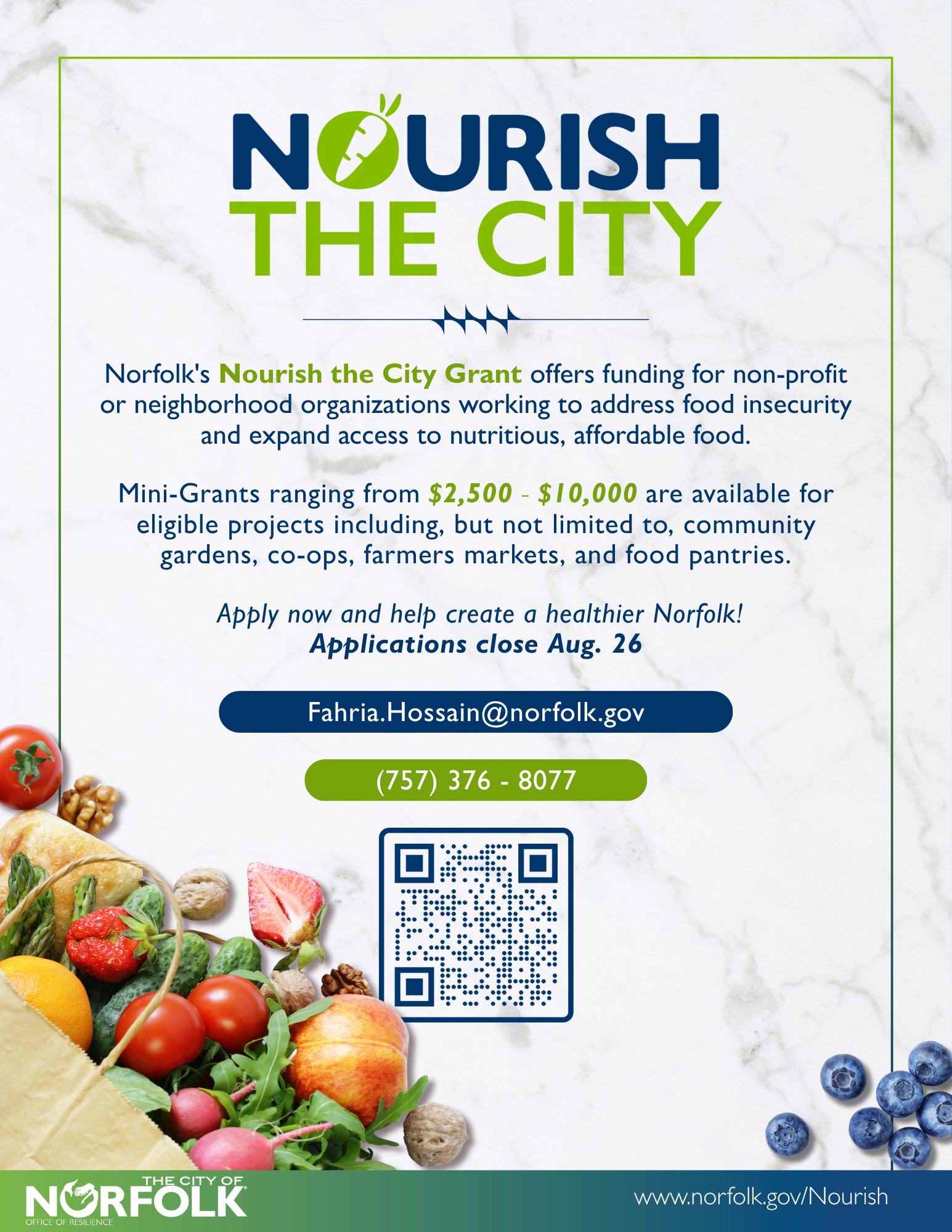 The City of Norfolk's Nourish the City Grant offers funding for non-profit or neighborhood organizations working to address food insecurity and expand access to nutritious, affordable food. Mini-Grants ranging from $2,500 - $10,000 are available for eligible projects including, but not limited to, community gardens, co-ops, farmers markets, and food pantries.