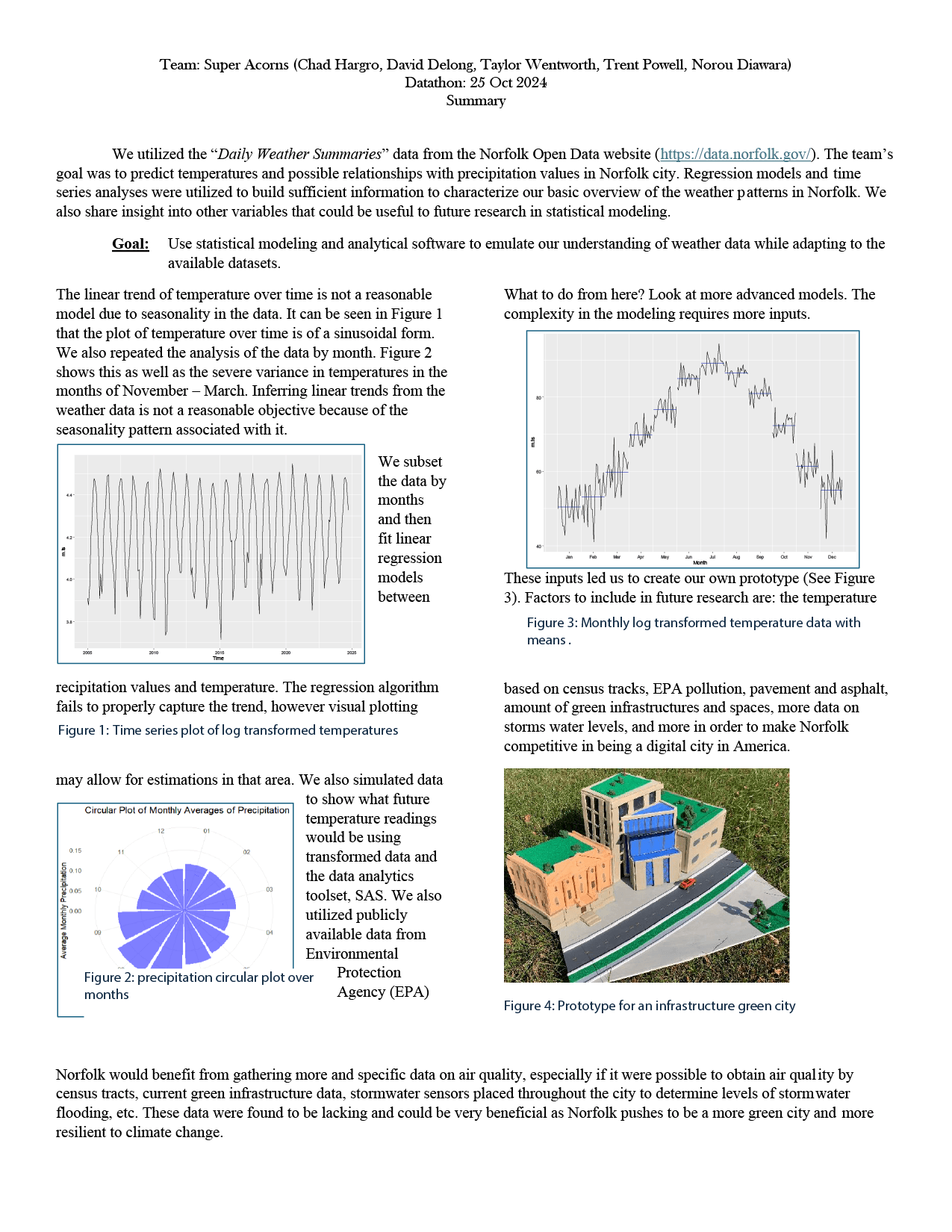 Each team was tasked with creating an interactive, dynamic presentation of their work. During the event, judges allowed each team 7 minutes to present their projects. Judges included Ken Pfeil, Chief Data Officer for the Commonwealth of Virginia; Steven Deberry, Executive Director of the Southside Network Authority; Keith Darrow, City of Norfolk Transportation Engineer; and Trent Buskirk, Professor and Provost Data Science Fellow at ODU. Presentations were evaluated on data analysis quality, engaging visualizations, relevance to the infrastructure theme, innovation and creativity, communication, and practicality. The winners of the Datathon are listed below!