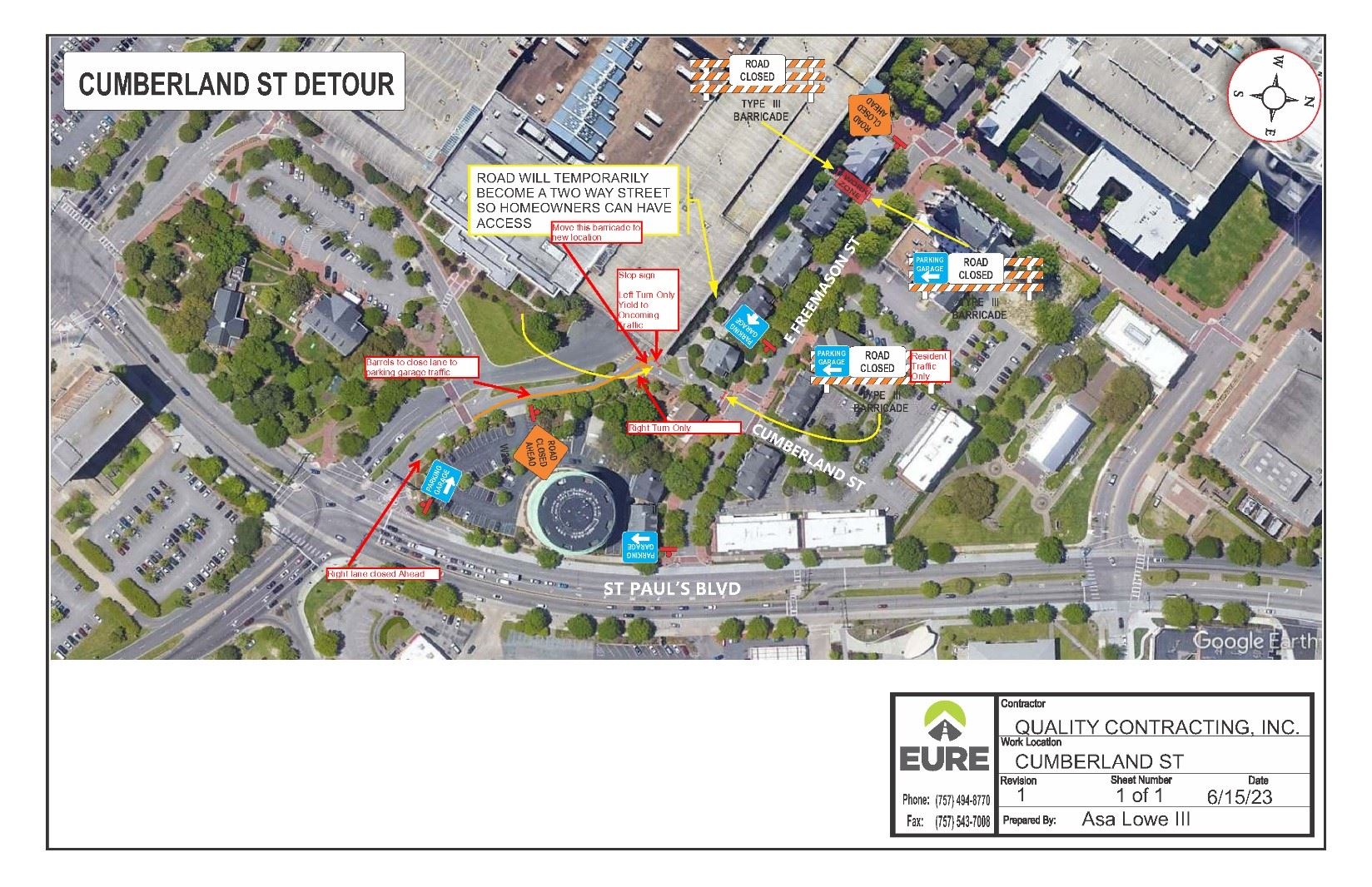 NORFOLK, VA – Beginning August 7 through September 15, road closures and traffic pattern changes will be in effect around Cumberland St., E. Freemason St., and entrances to the MacArthur Center Parking Garage from Cumberland St. provide heavy equipment access to make repairs to the Police and Fire Museum at 401 E. Freemason St.